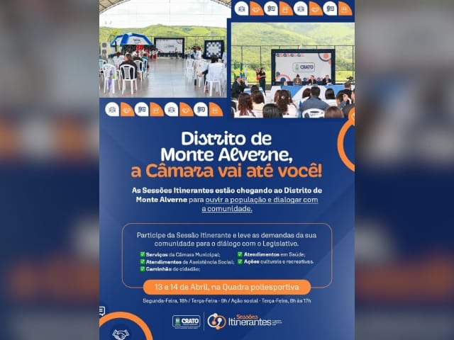 A Câmara Municipal do Crato realiza, nos dias 13 e 14 de abril, mais uma edição das sessões itinerantes, desta vez no distrito de Monte Alverne. A programação acontecerá na quadra poliesportiva da localidade e reunirá vereadores, serviços públicos e ações voltadas à comunidade.